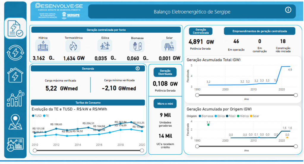 O Mapa Geoelétrico apresenta a estrutura energética de Sergipe de forma detalhada. A ferramenta permite visualizar: subestações de alta e média voltagem, linhas de transmissão de 500 kV e 230 kV, redes de distribuição, infraestrutura de gás natural e empreendimentos de geração planejados. Além disso, o sistema integra camadas ambientais e territoriais, como unidades de conservação federais e estaduais, terras indígenas e quilombolas, áreas protegidas pela Lei da Mata Atlântica, hidrografia e divisão municipal.